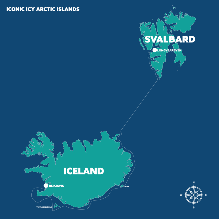 After a few days at sea, we’ll reach the archipelago of Svalbard, located halfway between Norway and the North Pole. Despite its remoteness, nearly 3,000 people live here, primarily in the main town of Longyearbyen, the world’s northernmost settlement. Svalbard is an International Arctic wildlife wonderland, home to reindeer, walruses, seabirds, and polar bears, regulated by a special treaty like Antarctica.